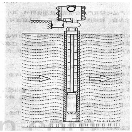 投入式液位計傳感器頭部有不鏽鋼帽保護,安裝前要取下才能進行安裝,並且要事先預埋一根鋼管在水裏作為投入式液位計的保護套管,套管上開孔。安裝如圖所示。